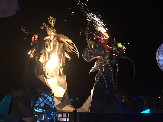 Therm made a fantastic piece - moths. Some of the Therm folks were in our camp this year, too. The moths are really loud and can be played like musical instruments. They are very percussive. They shoot colored flames - green and orange and yellow and red and bits of turquoise.